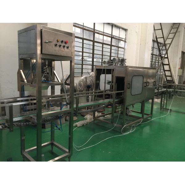 This filling line specially for 3-6 Gallon barreled drinking water. It integrates bottle washing filling and capping into one unit. In order to achieve the purpose of washing and sterilizing. The washing machine uses multi-washing liquid spray and thimerosal spray. The capping machine can cap barrel automatically. This line equips with water spraying device in order to ensure those caps sterile and clean.